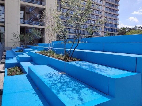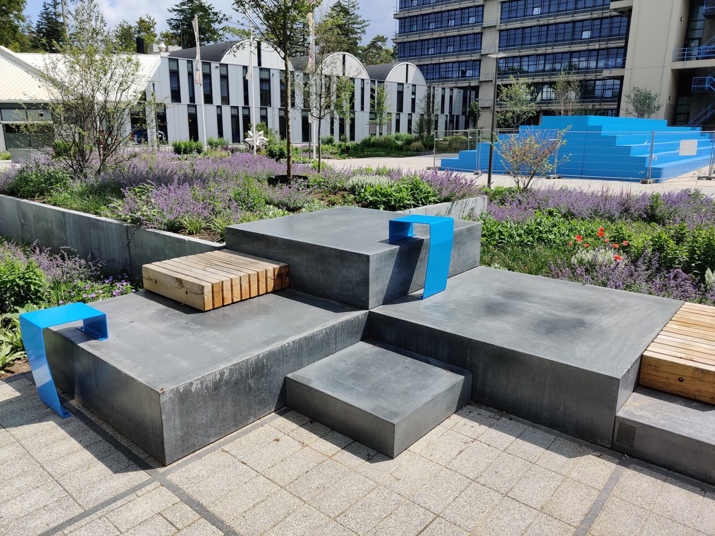 Dieser schöne blaue Stand befindet sich an der Universität von Enschede. Es hebt sich schön von den hohen Gebäuden der Umgebung ab. Die Natur kann in den Betonkübeln weiter wachsen. Auf diese Weise schafft man eine wunderschöne und einzigartige Kombination aus Kreativität und Natur.